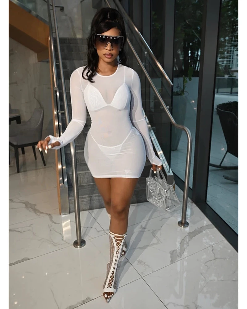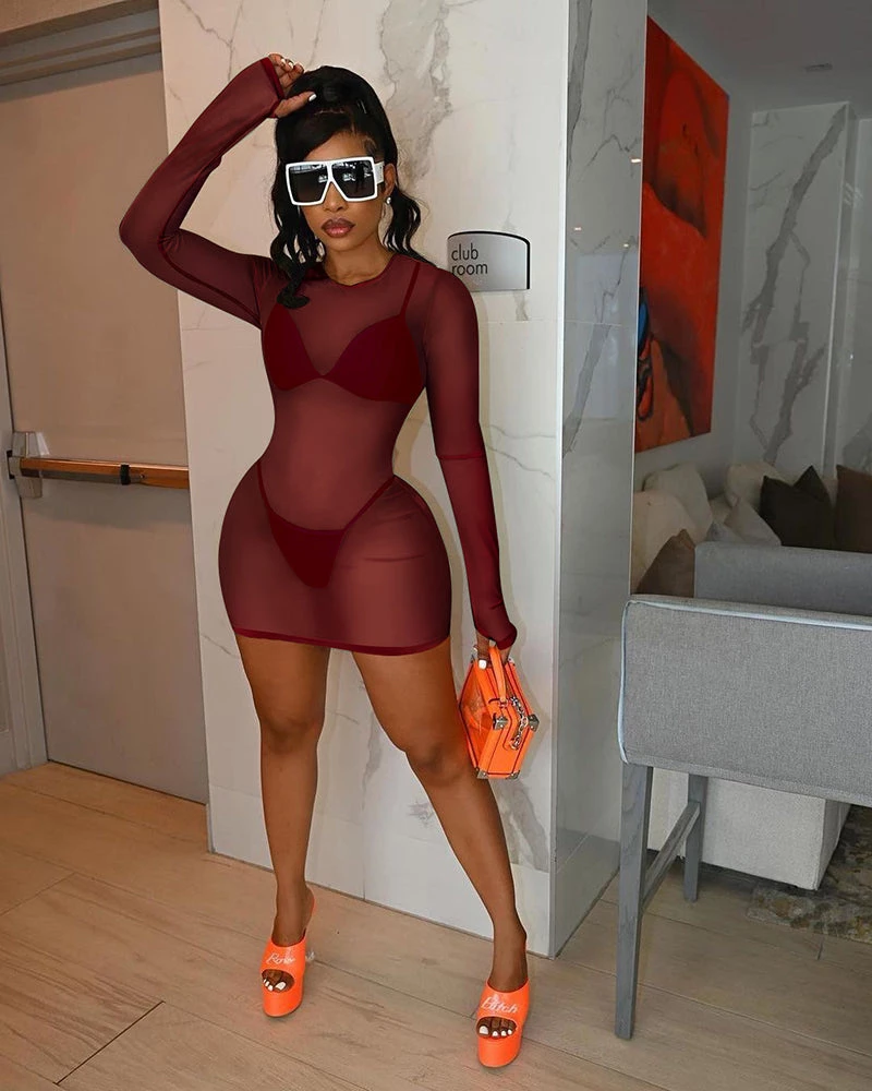 This Dress is very stretchy and fits beautifully. The material is a greta stretch mesh that clings to the body. The dress comes with a bra and panty to match.