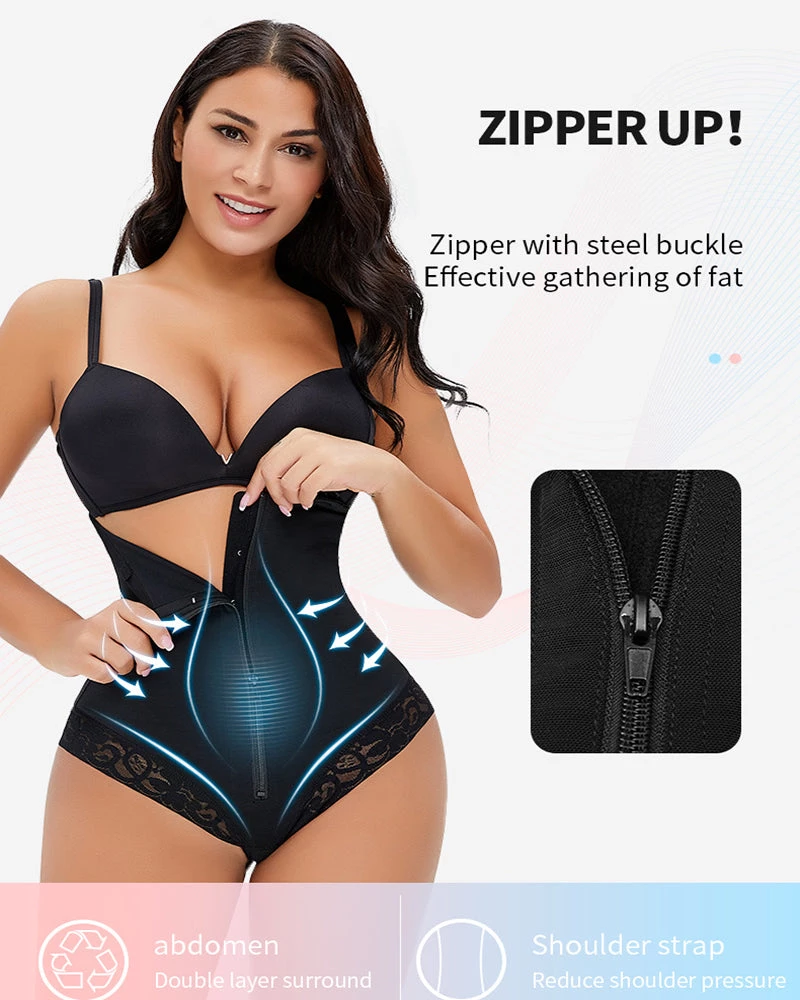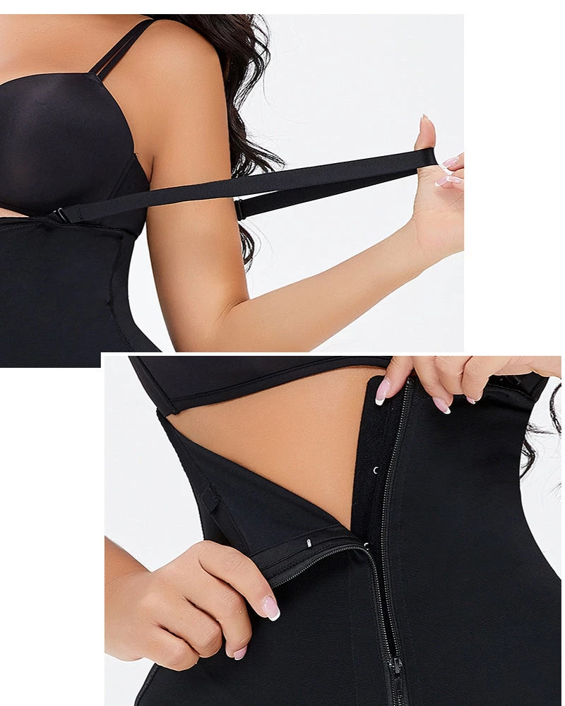 Has hooks , zipper , restroom access , removable straps, butt lift, stomach flattener