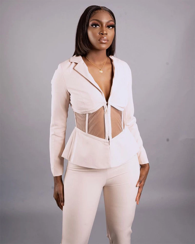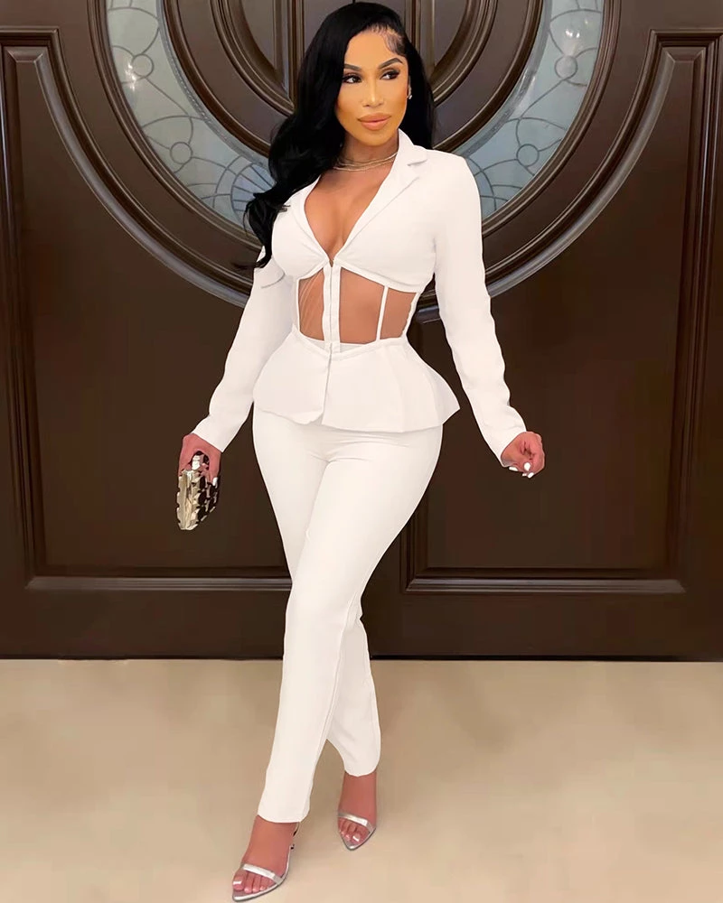 - A Blazer + Pant Set Featuring A Notched, Lapel collar With a hook placket front closure.