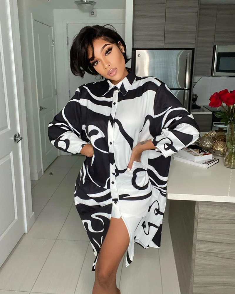 We love this beautiful dress so much!! Beautiful color with an abstract design! While you button it up, you can put on a warm coat and pair it with high heels. You also can take it as a outwear & Shirtdress!!