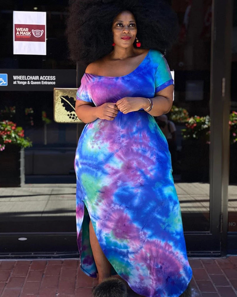 Featuring stretchy fabric, tie dyeing design, V neck, slit at both sides, with pockets, this pretty dress can be slimming and flattering.