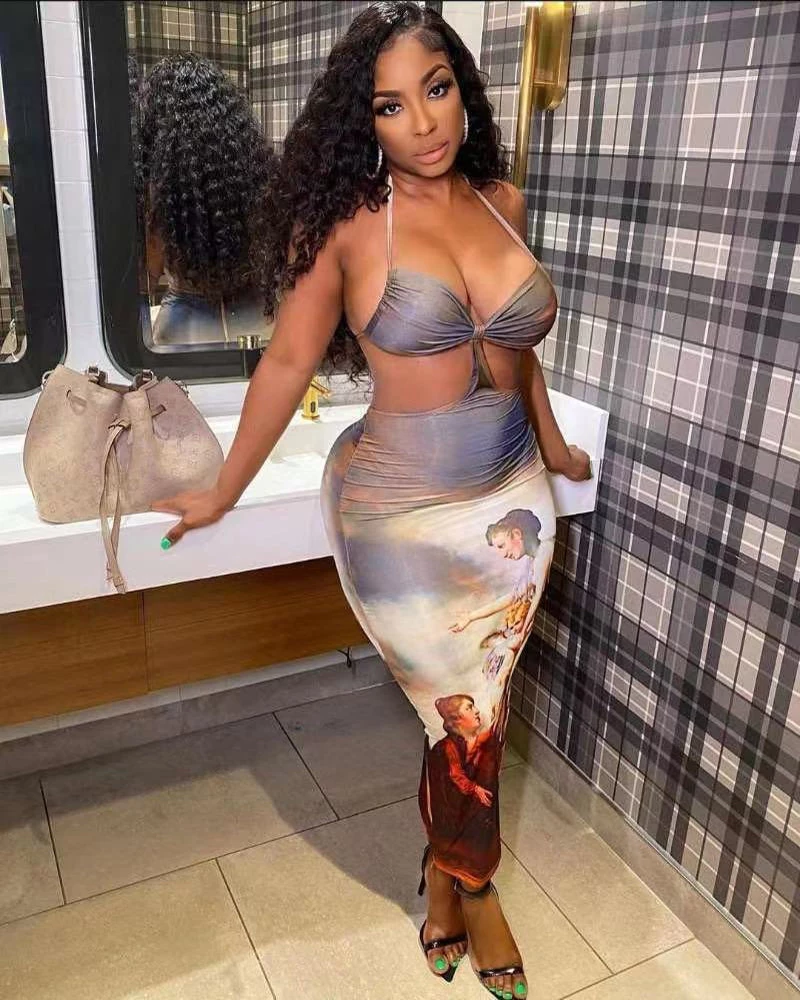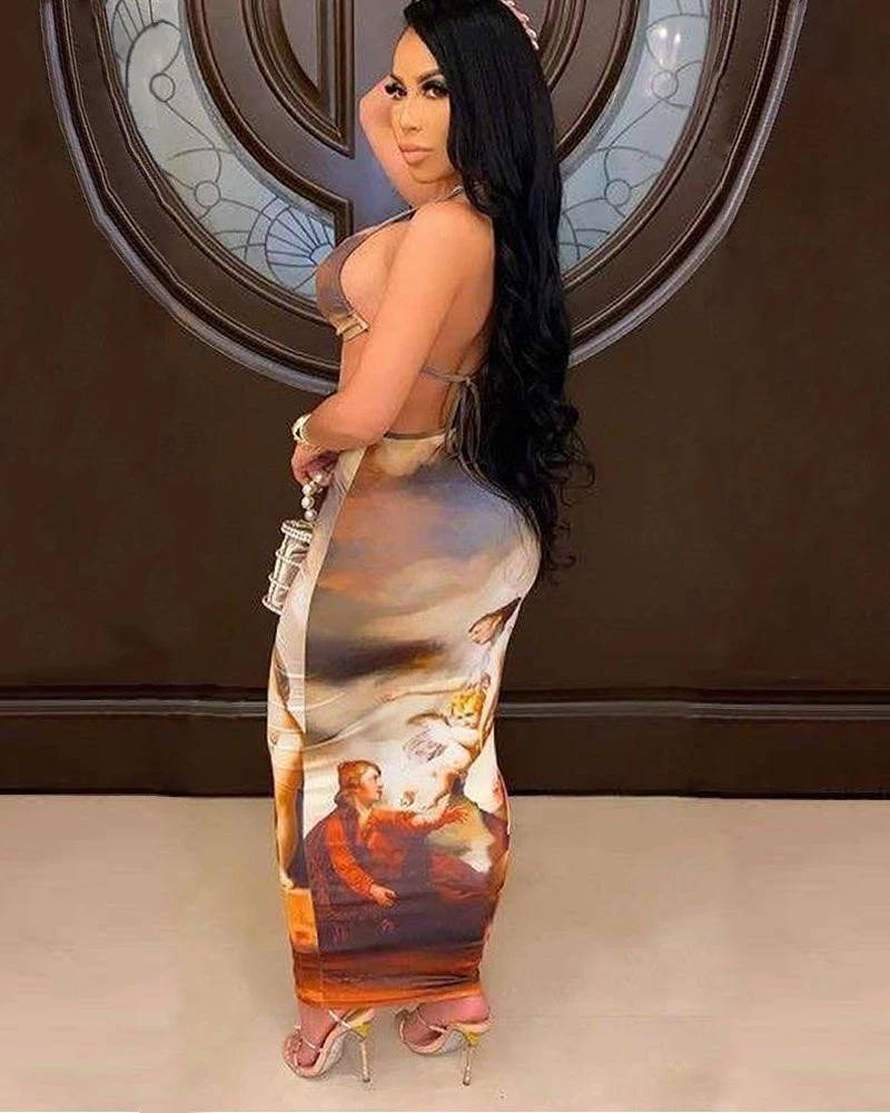 This maxi bodycon dress is sewn with a halter bra and the waist part is hollow out, so the whole style is very graceful and sexy, plus the Angel oil paint Print makes this dress so charming.