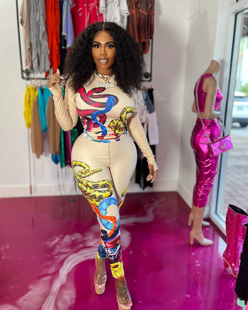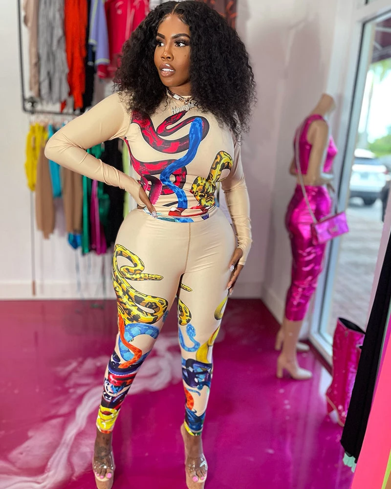 Be cute and chill in this set. The top and the bottom to this set have Color snake 2. The bottoms are high waist and gathered at the ankles. Perfect to dress up with heels or sneakers.