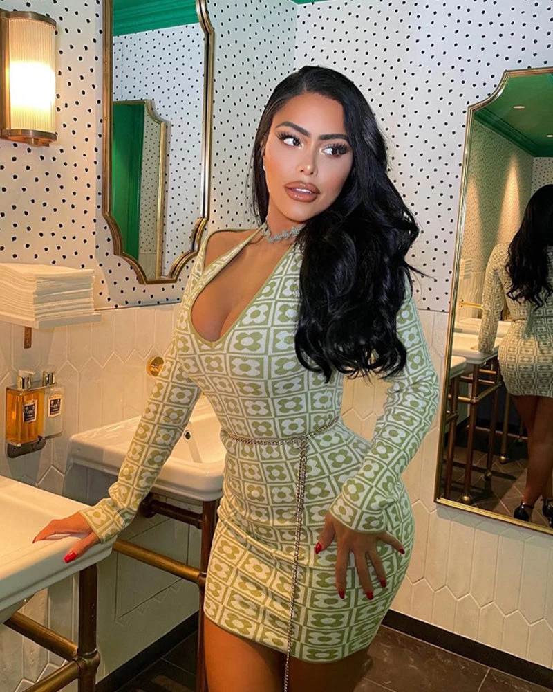 - Print Long Sleeve Hollow Out Sexy Mini Dress