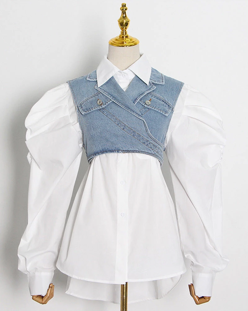 White collar shirt with puff shoulders & Denim vest that can be worn two ways. Model wearing small.