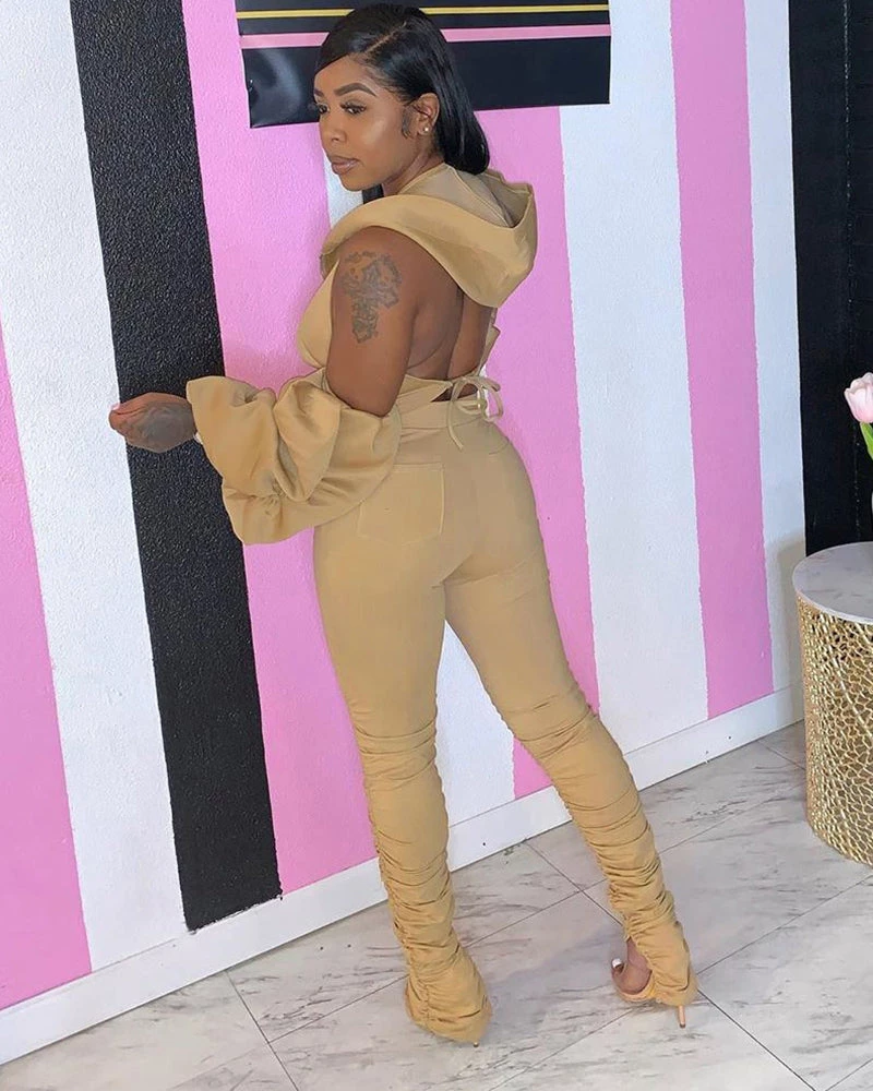 The perfect wardrobe addition for fall occasions. This set includes a relaxed fit top and a pair of ruched wing pant. Featuring stretch fabric, simple backless design and hoodie.