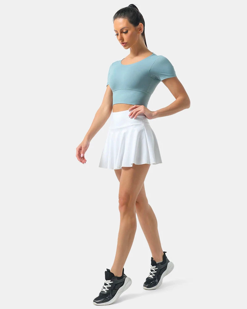 This sustainable skirt. This is a high-rise, pleated micro tennis skirt with built-in compressive-feel undershorts and functional ball pockets. The skirt is made from lightweight and stretchy sweat-wicking fabric made with recycled materials, while the undershorts are made with TnaSLICK™ — supportive, ultra-stretch performance fabric with a cool, smooth feel.
