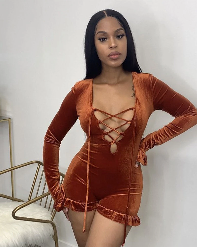 A velvet romper with front ties and strings.