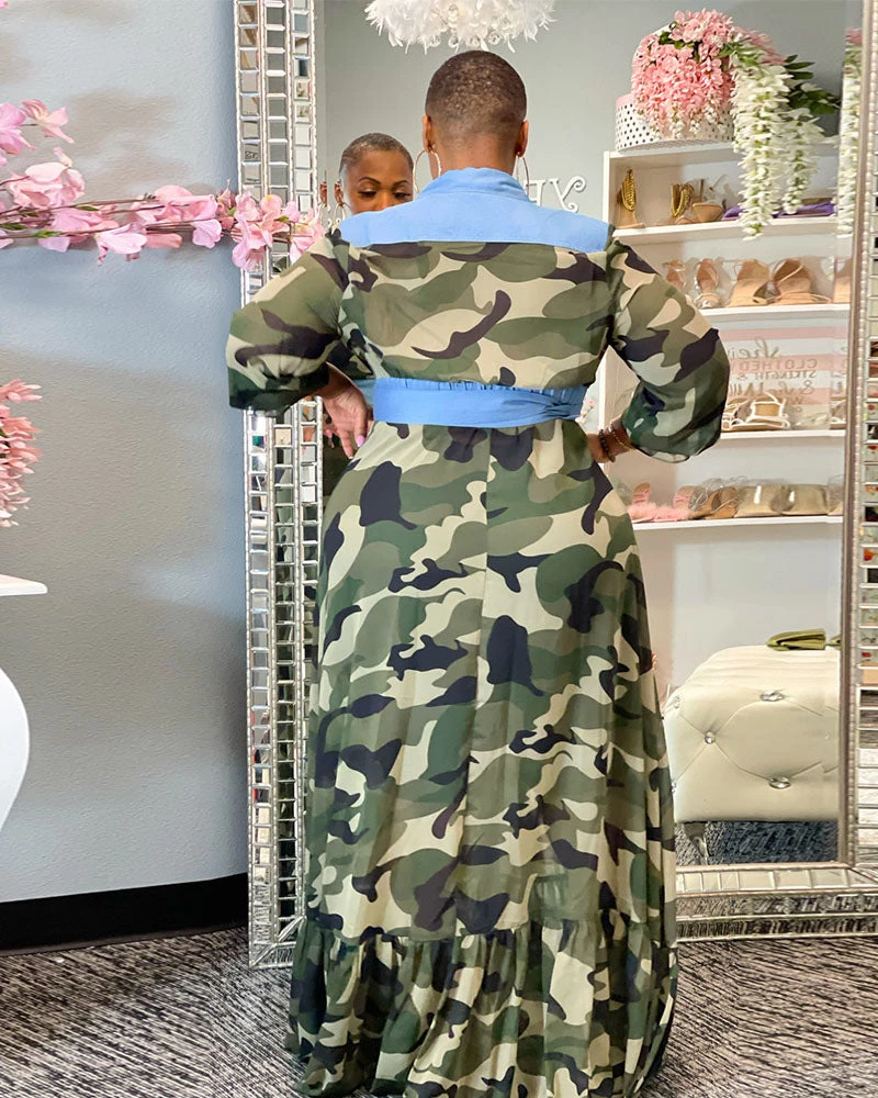 - Chiffon Denim Contrast Button Down Maxi Dress with Belt