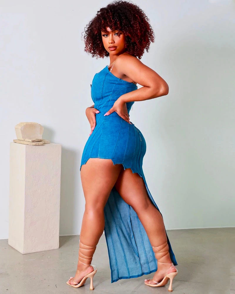 Yasss this denim asymmetrical dress is a stunner. Features a stretchy denim fabric, adjustable clear straps, back zipper closure.