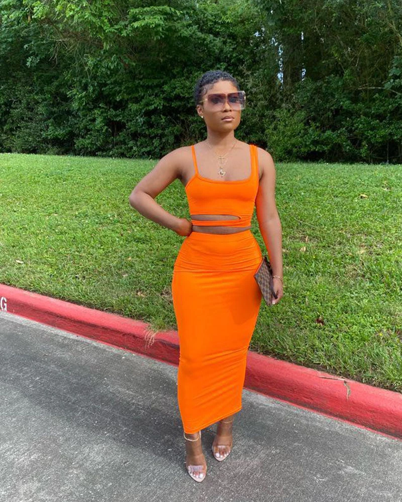 Two piece set featuring a cropped spaghetti strap top with a matching midi skirtÂ