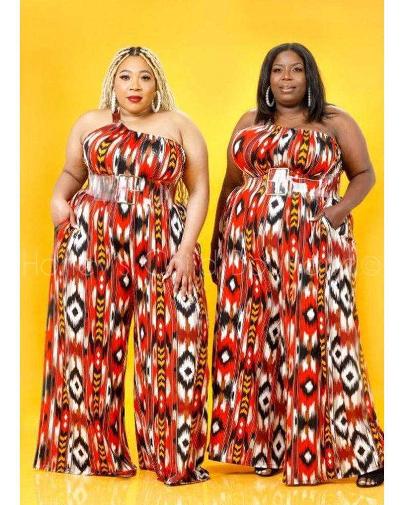 - Dramatic one shoulder jumpsuit with colorful tribal motif