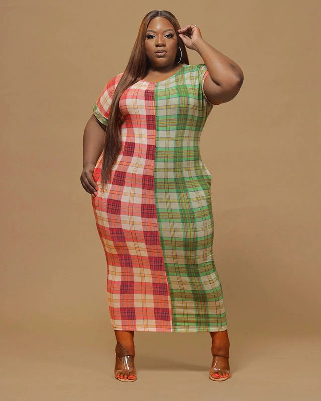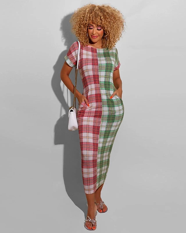 Featuring picnic placid fabric, V neck, pockets at sides, this pretty dress can be slimming and flattering.