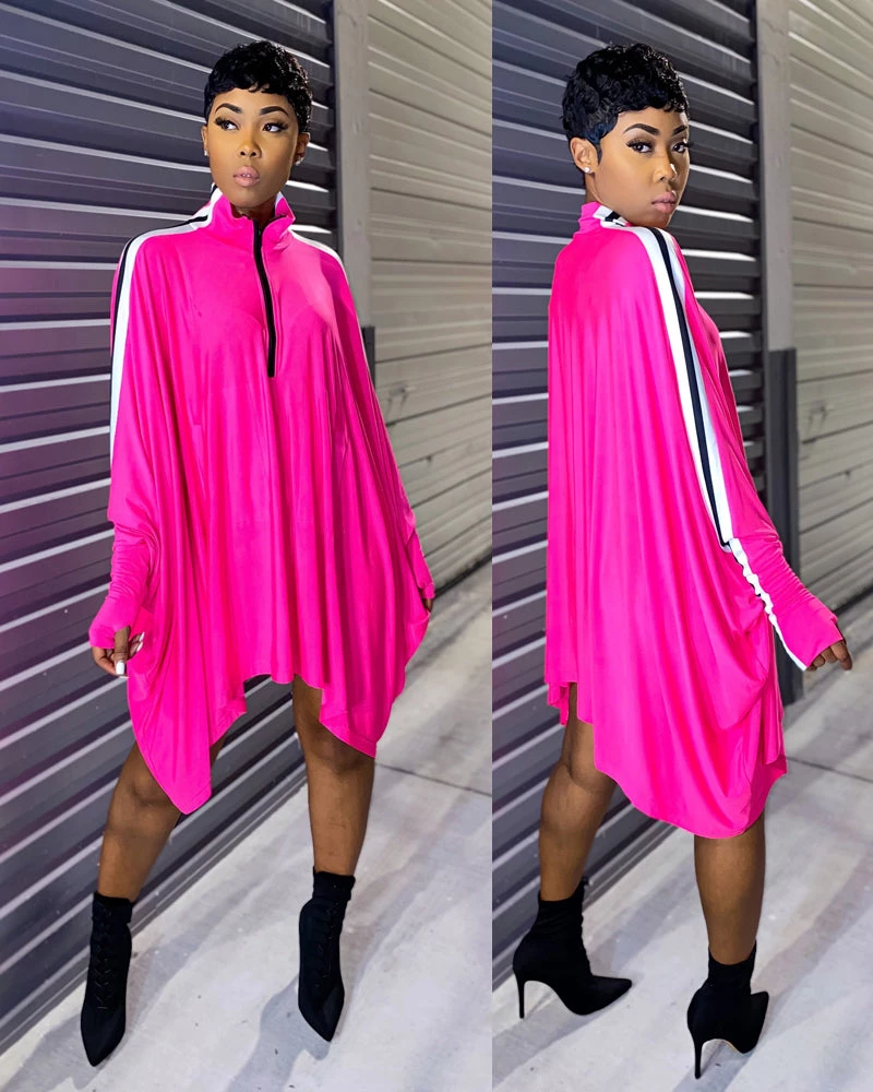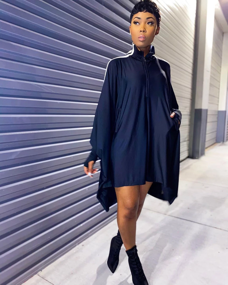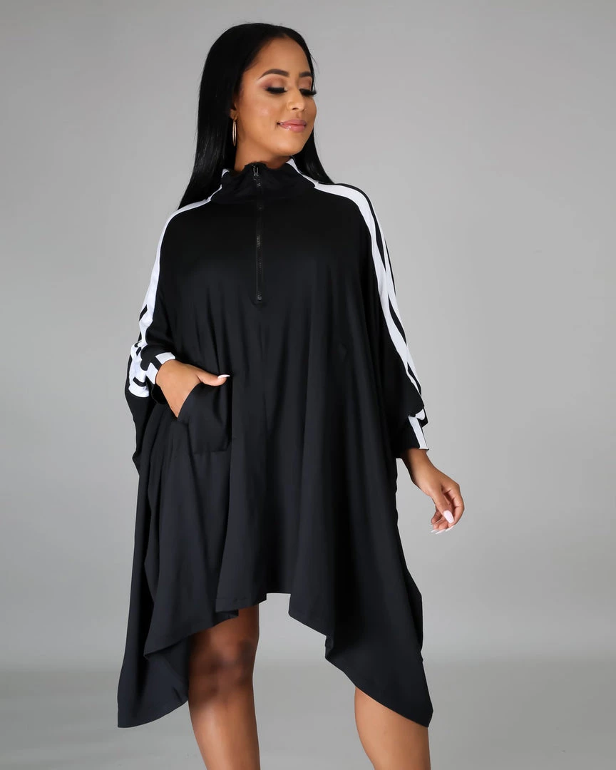 This is a closet must have. Solid oversized cape style dress, with a zippered neckline, and varsity stripe accented dolman sleeves. Two side pocket -Oversize loose fit -Lightweight stretchy!Pair with heels, booties or sneakers.