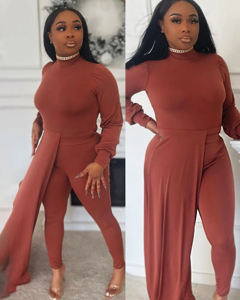 Stretch bodysuit, Round neckline, Long sleeves, Long side train, Zipper closure.