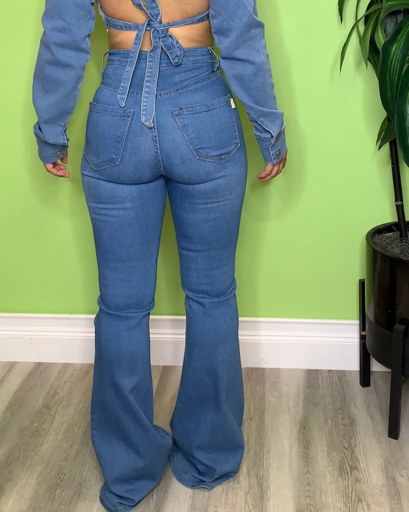 A long sleeve denim top with an open back