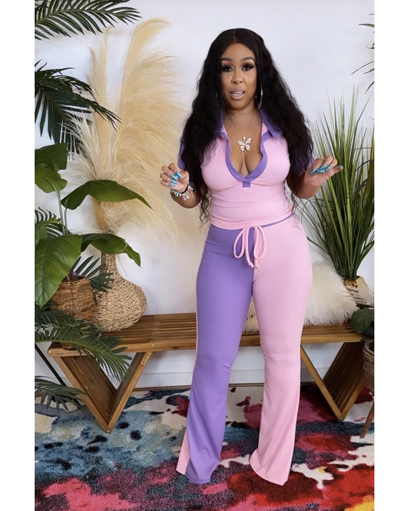 Good Vibes Only! Our Laurie 2pc set is here to take you back! With it’s 70’s inspired bell bottoms pants, short sleeve top with a winged collar. Featuring pink and purple color block design.