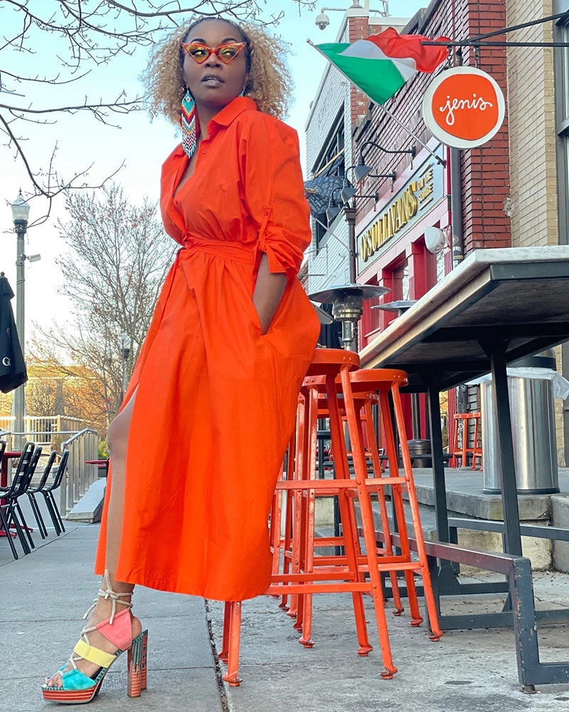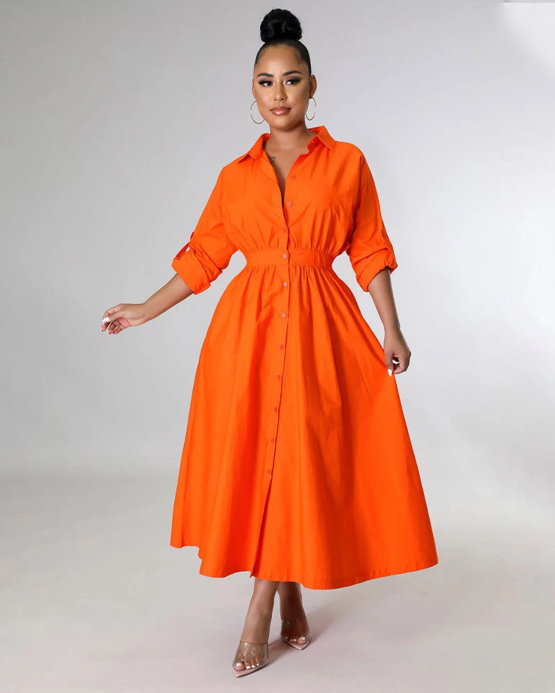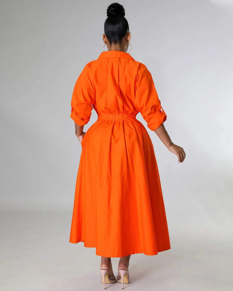 The perfect dress every woman needs, this orange crush dress can be worn open as a duster or as a dress. Collared, button down front with side pockets, short button side sleeves
