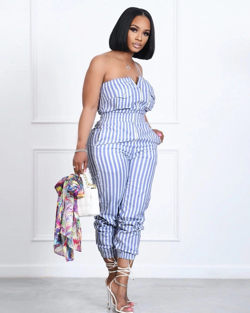 This Stripe Halter Tube Top, and vertical stripes that offer a casual and contemporary style. This Jumpsuit is the perfect piece to wear to brunch, at the beach, or anywhere you want a loose-fitting, airy look. Paired with white heels and a straw handbag, this jumpsuit is sure to impress…