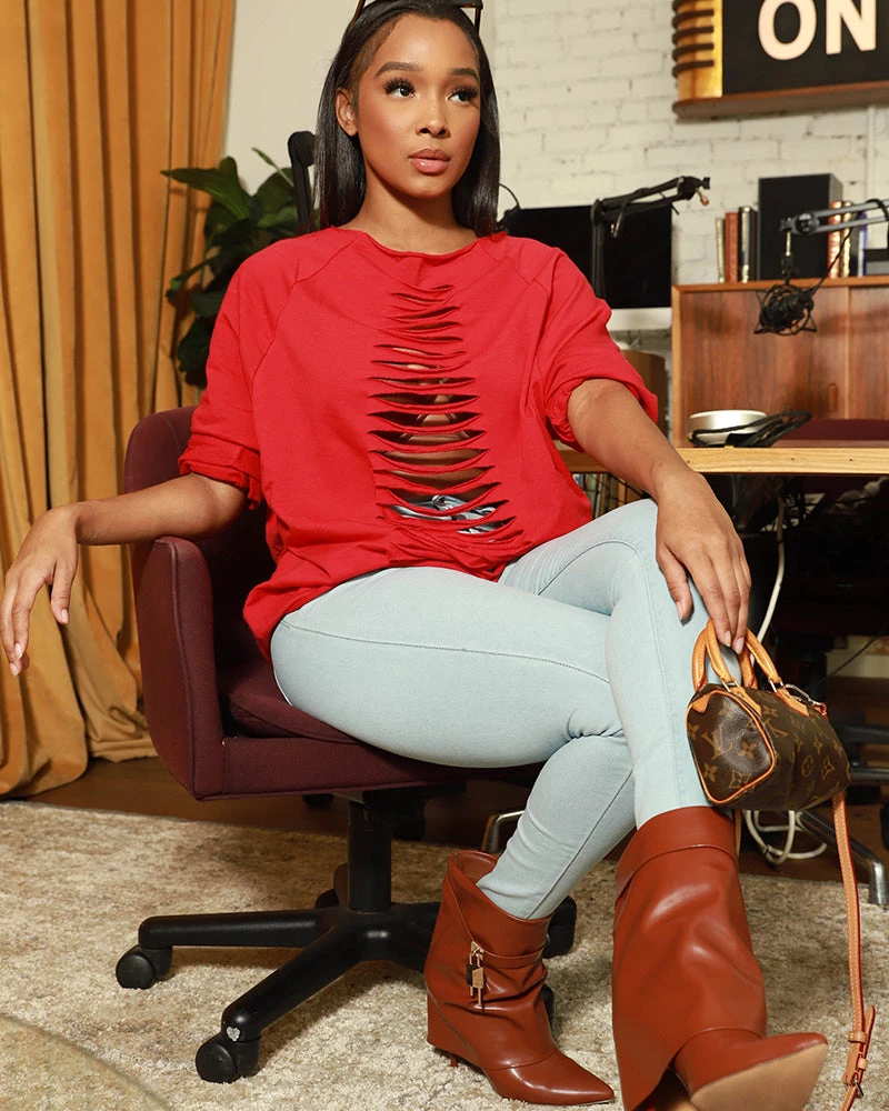 - Depending on how you want it to fit go up or down in size. Either way you style this sweatshirt it’s sexy & daring! Wear it with the rips in the front or back, dressed up or down. Faux zippers on the arm, heavy but comfy fit.