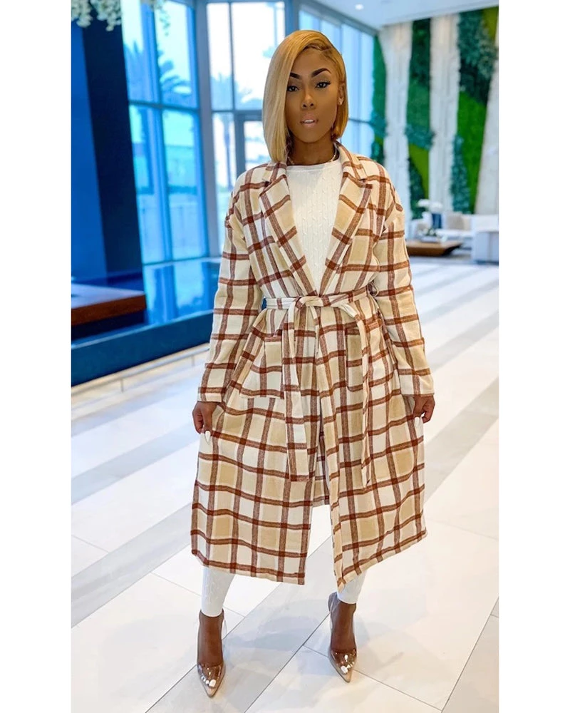 This flannel open front jacket is perfect for the season. Features a collar neckline, front pockets and self tie waist belt, with side slits.