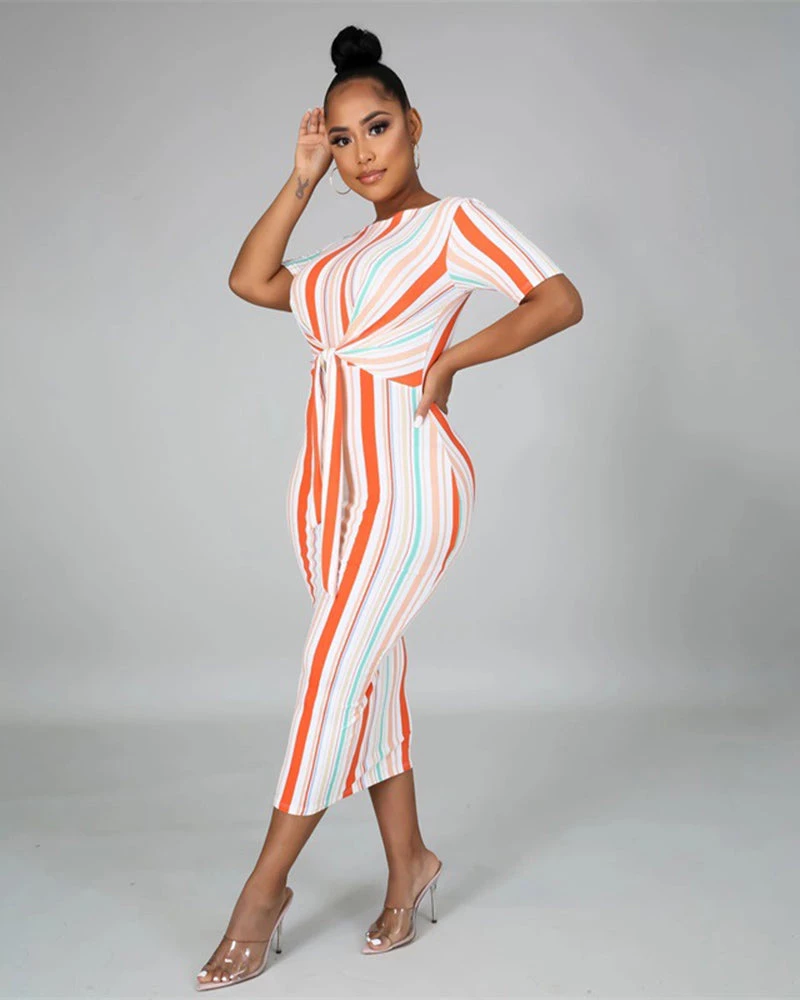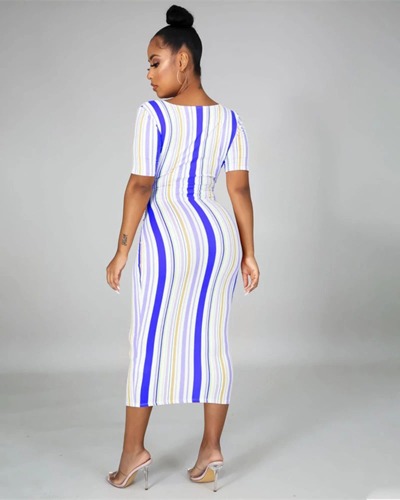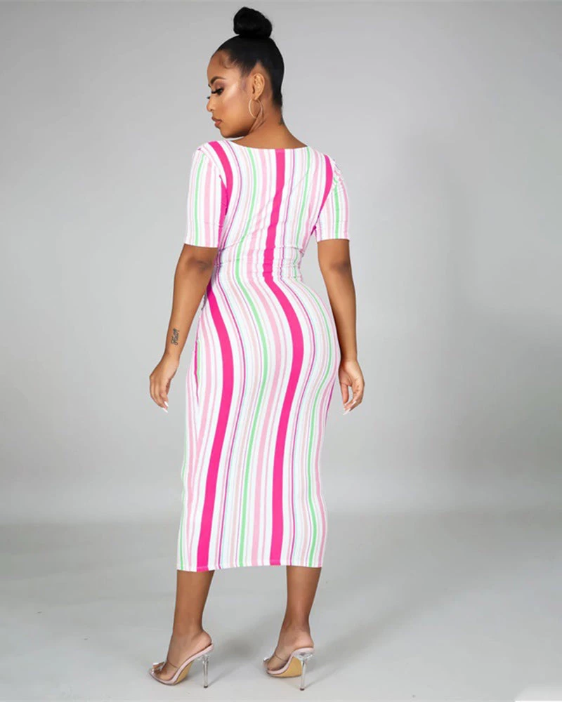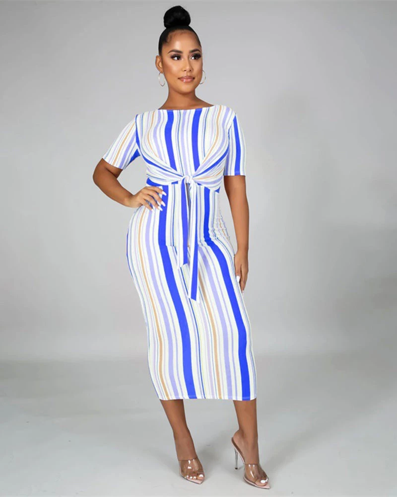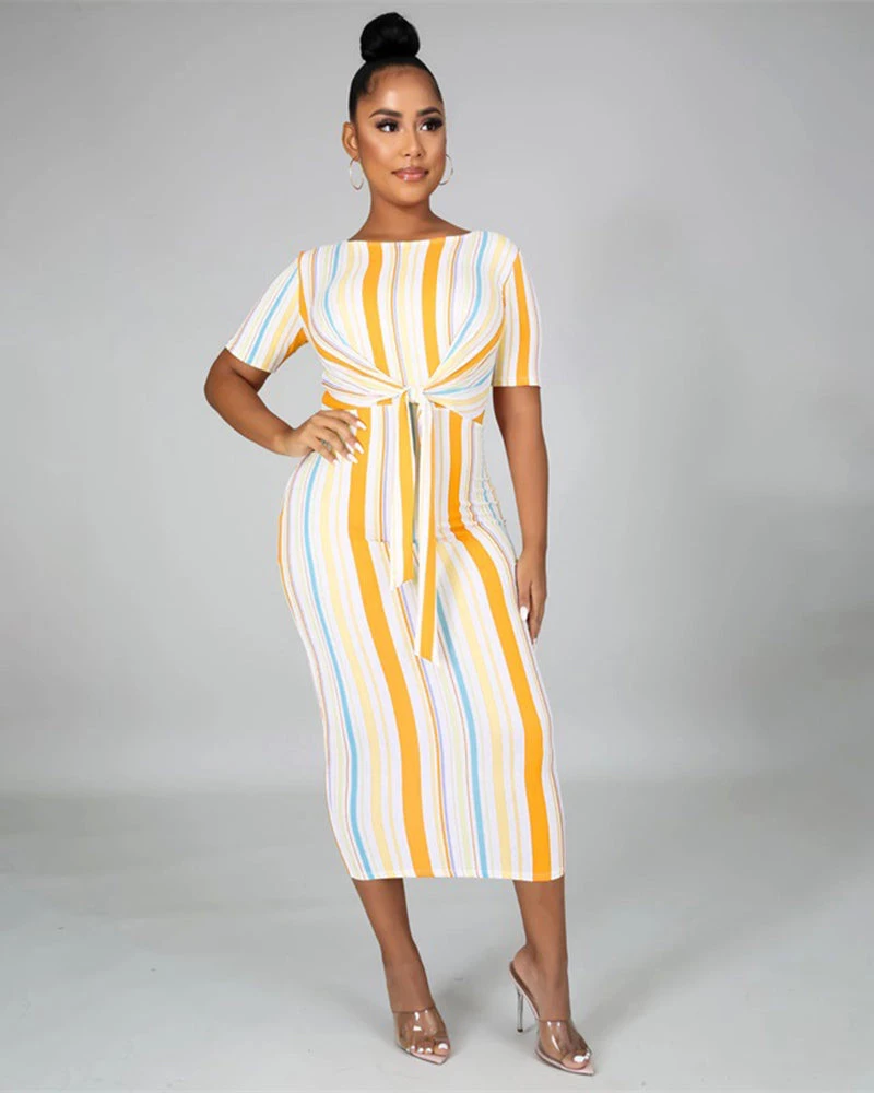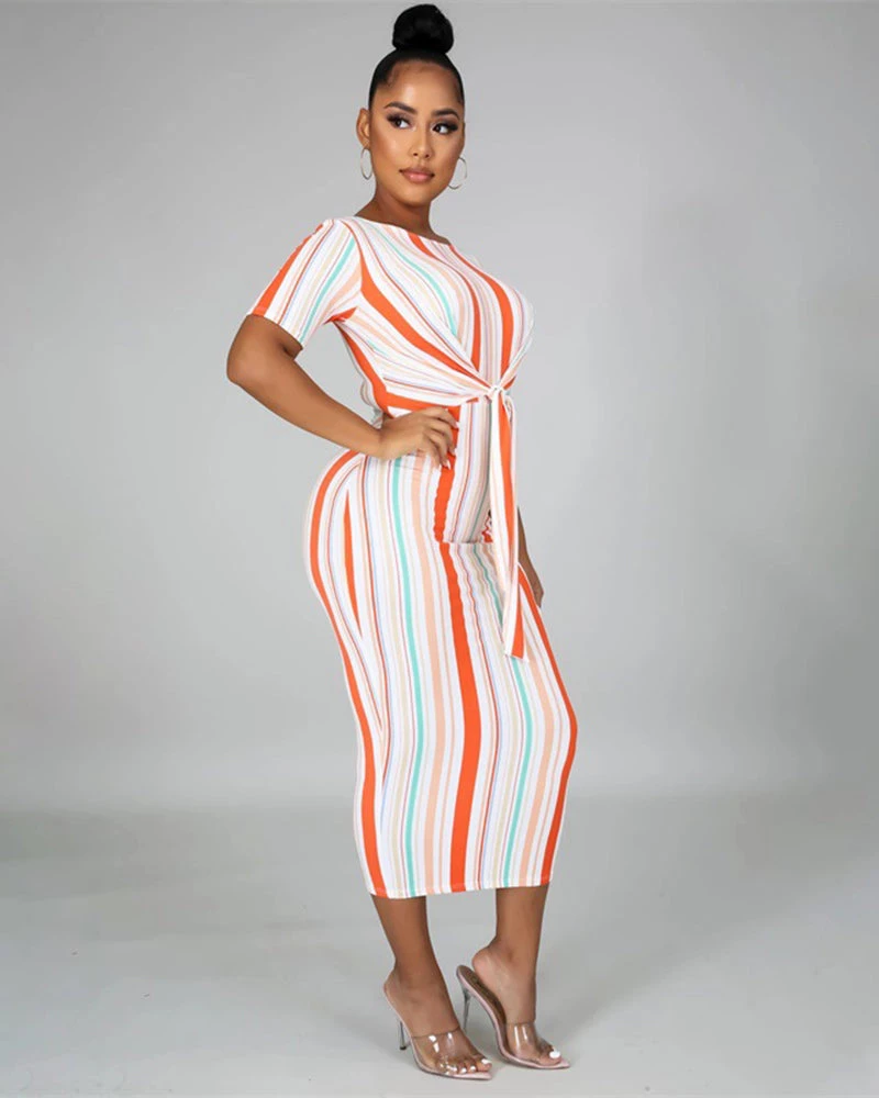 Stripe design is one of the popular trend this summer, and this dress is a necessary list in wardrobe with fashionable and simple design. Featuring stretch fabric, self-tie design, and midi sleeves, this pretty dress can be slimming and flattering.