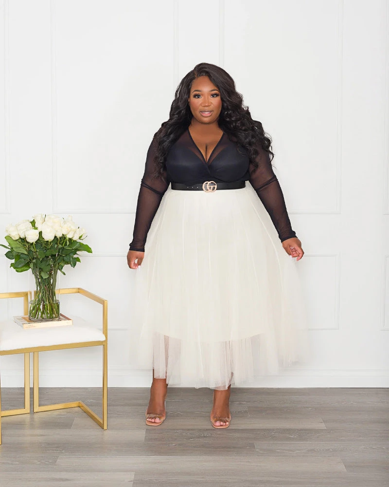 Tulle Skirt features an elastic waist, an ankle length, below the knee-length lining, and layers of tulle.